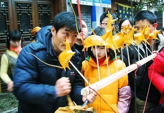 细腻的白糖,恰到好处的火候,熬一锅金灿灿的糖稀。老人手里的工具一番辗转腾挪,一个个栩栩如生的糖人就出现了。这样精致且带着余温的“艺术品”,拿在手里,你舍得将它融化吗?