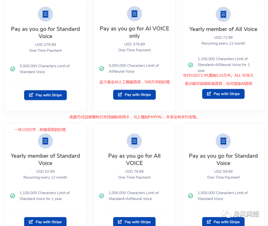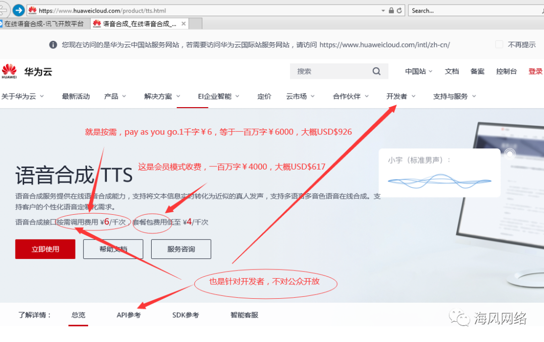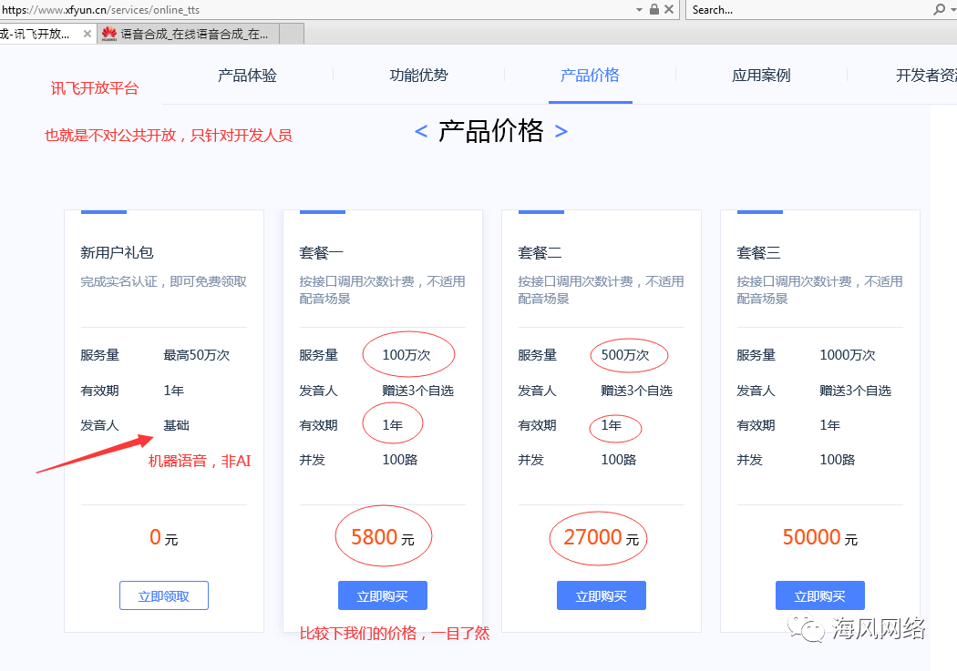 他们的文字转语音,并没有对普通人开放,只对程序开发者。也就是说,普通人用不了。即时是对普通公众开放的,这个价格,依然高于aivoicer,并且他们顶多也就10来种语言。配音套餐方面,他们是88 元/万字,100万字是8800元=USD$1359,而aivoicer的100万字的标准语音是USD$59.99,AI语音是USD$79.99,并且无使用时间限制,而且是对公众开放的,你不需要是一名程序开发者。性价比,一目了然。