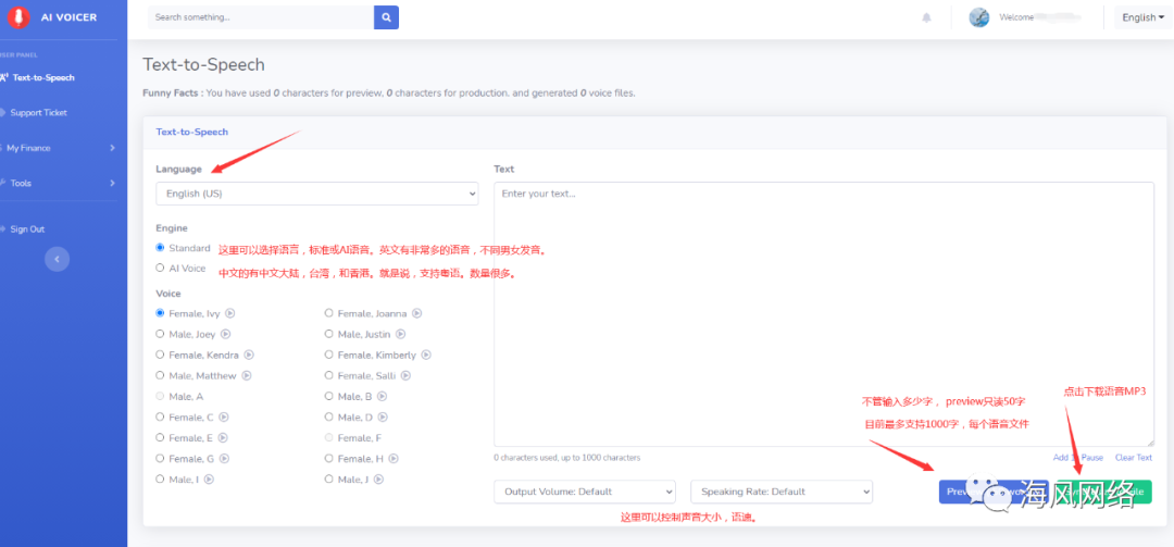 你可以选择按量按需购买,也就是pay as you go,也可以年付,性价比更好些。按量购买没有使用时间限制,直到限制的字数用完,字数在后台会有显示,用了多少,preview只能读50个字,但下载下来的MP3则是完整的,最多单次2000个字,未来会增加。按需的如果额度不够了,可以选择“