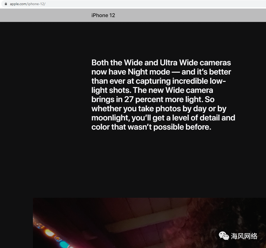 “广角和超广角相机现在都有夜间模式,它比以往任何时候都能更好地捕捉令人难以置信的微光拍摄。新的广角相机带来了27%的光线。因此,无论你是在白天还是在月光下拍照,你都会得到以前不可能得到的细节和颜色。”